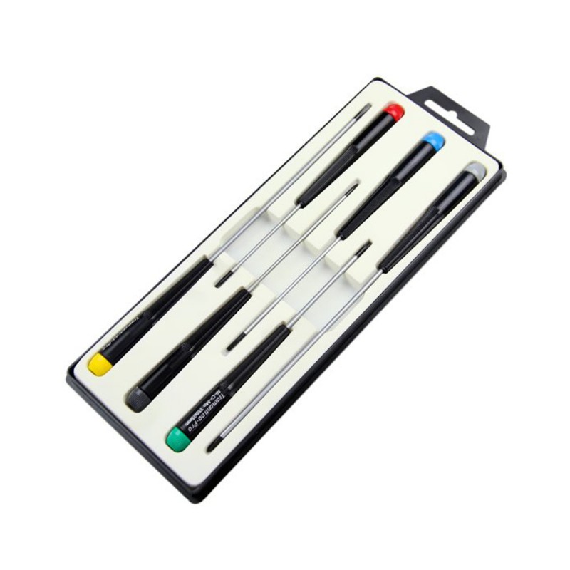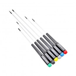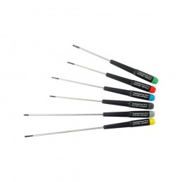 Compuesta por destornilladores punta chata (2.5 mm, 3 mm), cruzada (nr.0) y trafix (T8, T10).