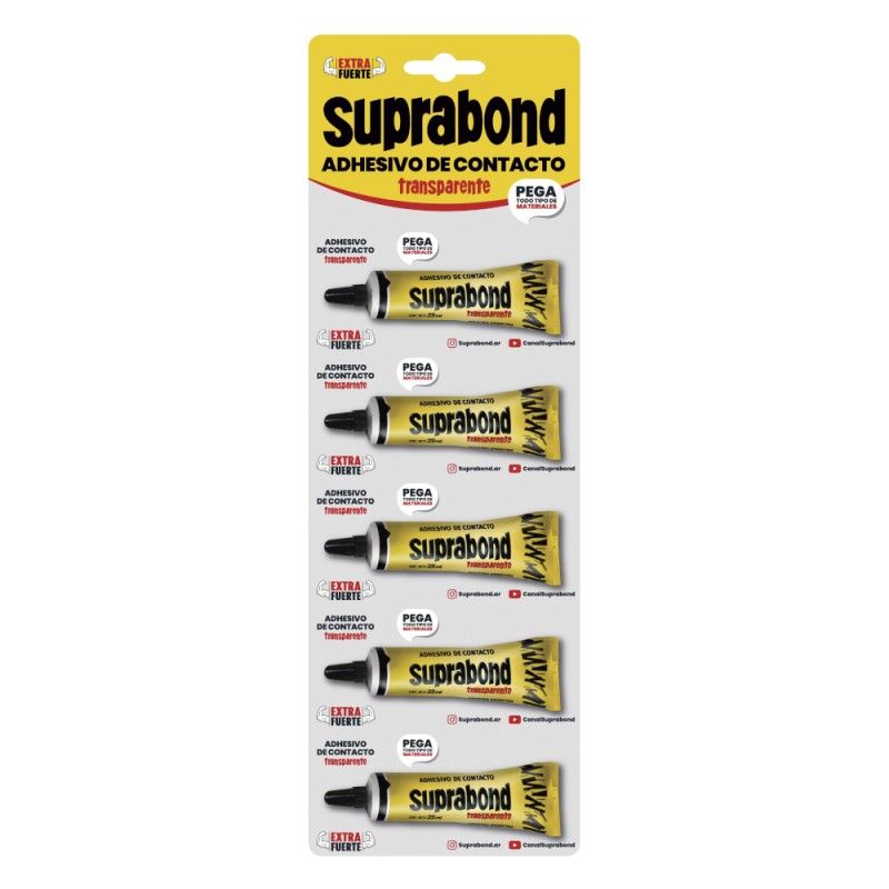 Pack: 10 tiras x 5U // Adhesivo de contacto de alta calidad.Es ideal para realizar trabajos de gran exigencia que requieran prolijidad, precisión y alto poder de adhesión. Pega todo tipo de materiales y su pico aplicador permite dosificar pequeñas cantidades. Ideal para pegar superficies no porosas tales como metal, vidrio o Telgopor® donde es necesario orear antes de unir las partes. Posee bajo olor.