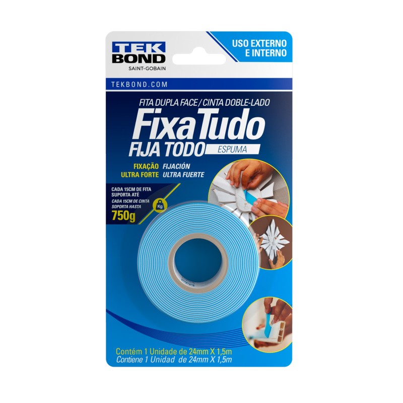 708254 - La Cinta Fija Todo Espuma Tekbond fue desarrollada para promover una fijación ultra fuerte de manera fácil, rápida y segura. Con ella, usted cuelga cuadros, objetos de decoración, canales y una infinidad de otras piezas. Adhiere muy bien a maderas, paredes, vidrios, acrÃlicos y metales.
