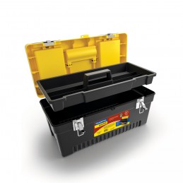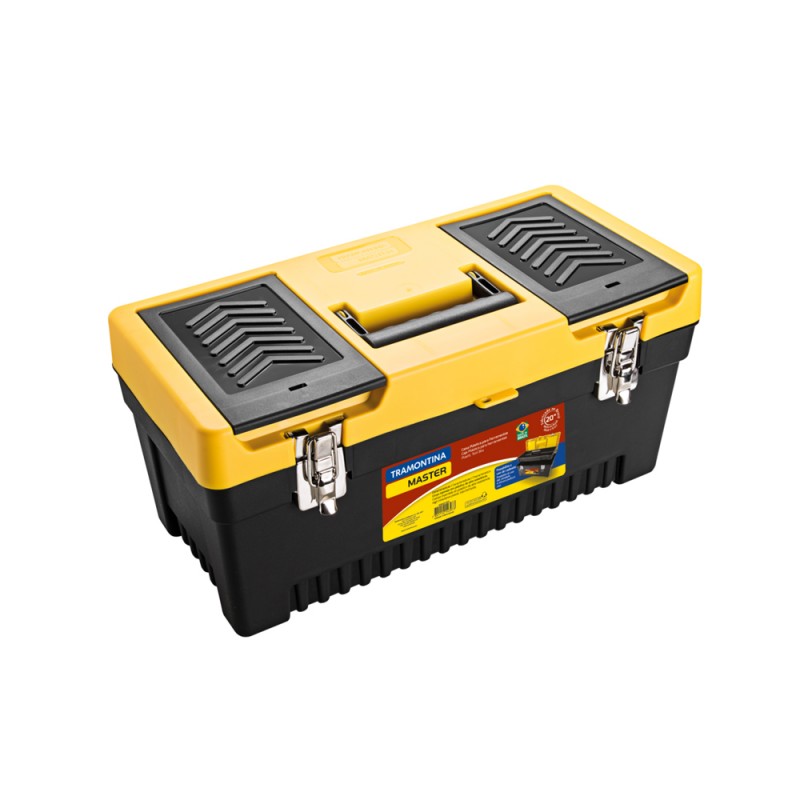Cuerpo inyectado en plástico de alta resistencia. Cerradura metálica con acabado niquelado. Caja utilizada para facilitar lo transporte y almacenamiento de herramientas durante el trabajo. Posibilita el uso del candado. Bandeja plástica interna removible. Dos compartimientos superiores en la tapa para almacenamiento de piezas pequeñas.