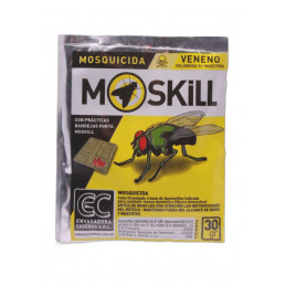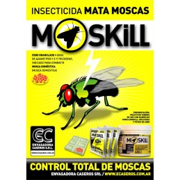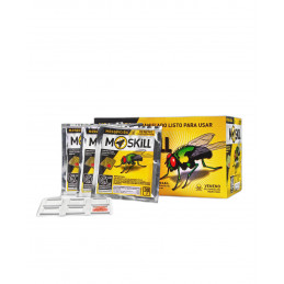 CAJA X2U - Mosquicida granulado a base de Azametifos al 1 % con Z-9 Tricosene (feromona de atracción sexual). Colocar en bandejas plásticas o platos plásticos descartables, aplicandoles cola vinÃlica para adherir el moskill. Utilizar el cebo Moskil en sus respectivas bandejas arriba de alacenas, arriba de la heladera y de campanas de extracción de cocina, en lugares planos y en lo pisible sin ventilación cruzada para evitar que vuele el cebo.